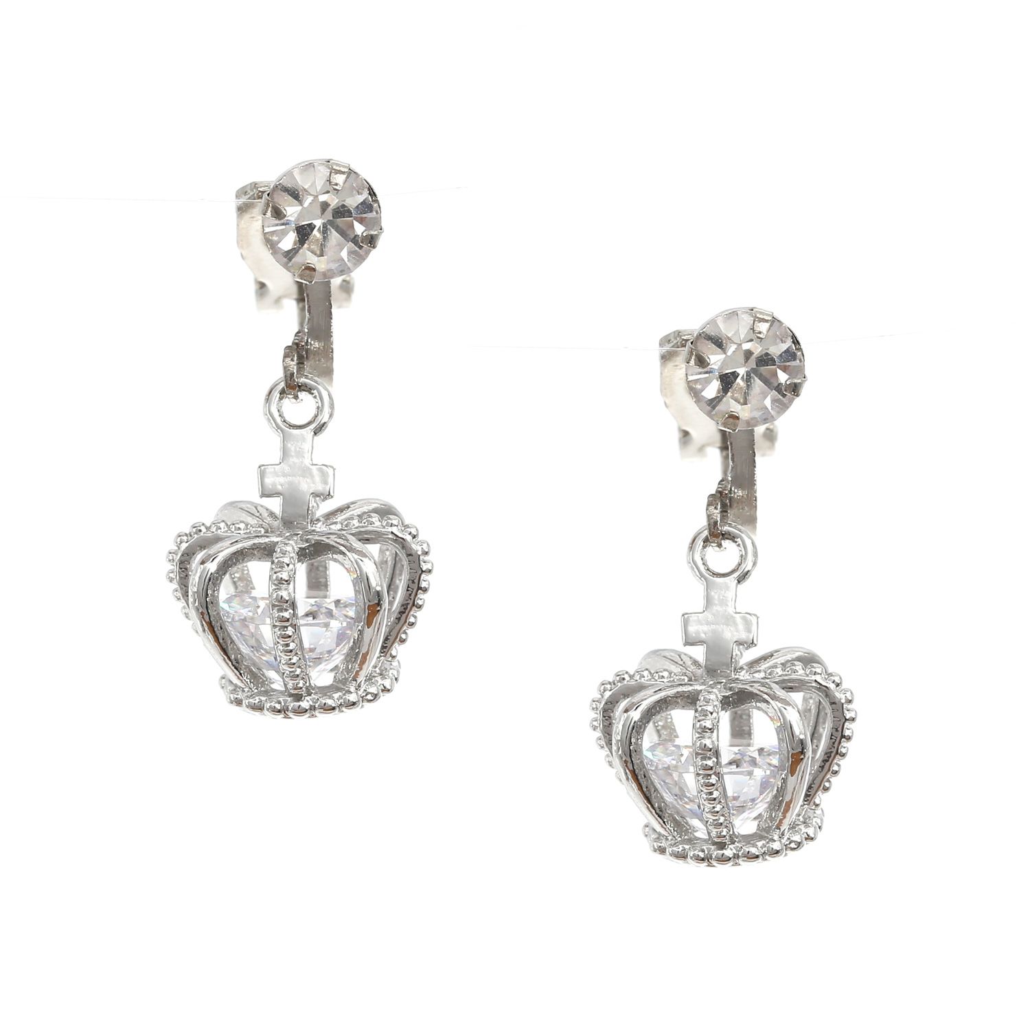 Silver-tone Crown CZ Drop Clip On Earrings