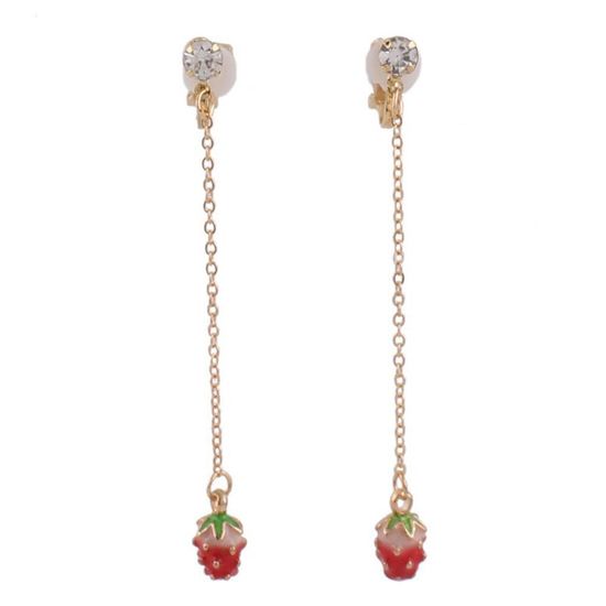 Cute enamel red whole strawberry with crystal and gold-tone clips and chain drop clip-on earrings. Lovely pair of clip on earrings that ideal for non-pierced ears. Perfect gift to give away or a treat for yourself. No piercing required to wear these earrings. Earrings size approx. 7 x 77 mm and come with cushion rubber pads for comfortable ears wear.